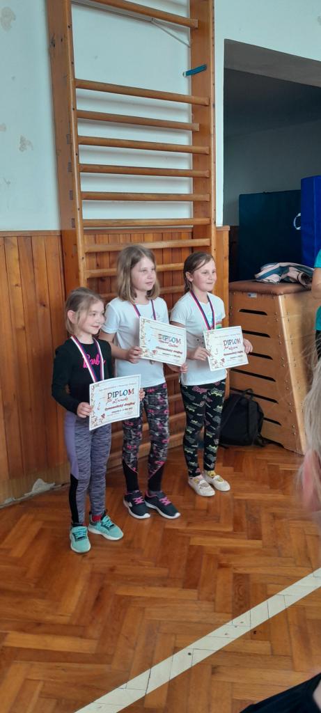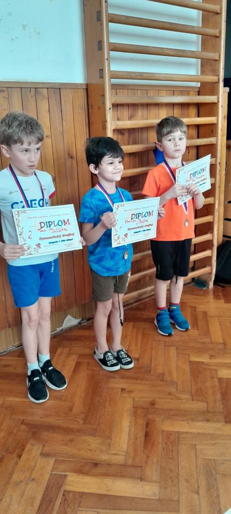 Z naší školy se zúčastnilo 17 žáků z 1. - 3. třídy. Cvičilo se v kategorii PROSTNÁ /povinná sestava/ a ODRAZ /skok z můstku s prohnutím/. Naši malí gymnasté získali pět umístění: