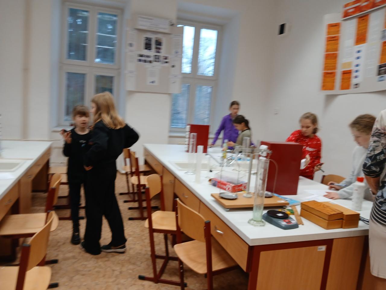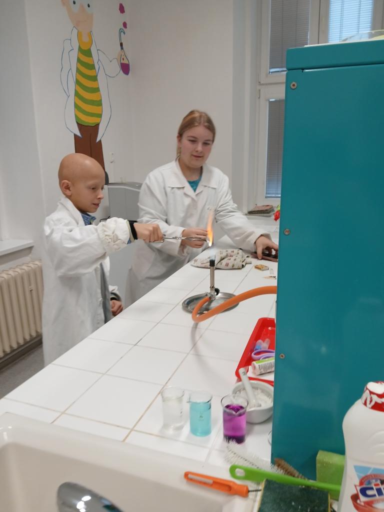 Nahledli tak do chemické a fyzikální laboratoře, kde si vyzkoušeli několik zajímavých pokusů, v malé tělocvičně kromě práce s věcmi různých tvarů a z různých materiálů si zkusili také vytvořit vlastní výrobek jen z papíru, špejlí a kolíčků. Nakonec si vyzkoušeli, jak jsou na tom se znalostmi angličtiny, ale z oblasti odborných výrazů z chemie. Celý program byl velmi zajímavý a dětem se moc líbil.